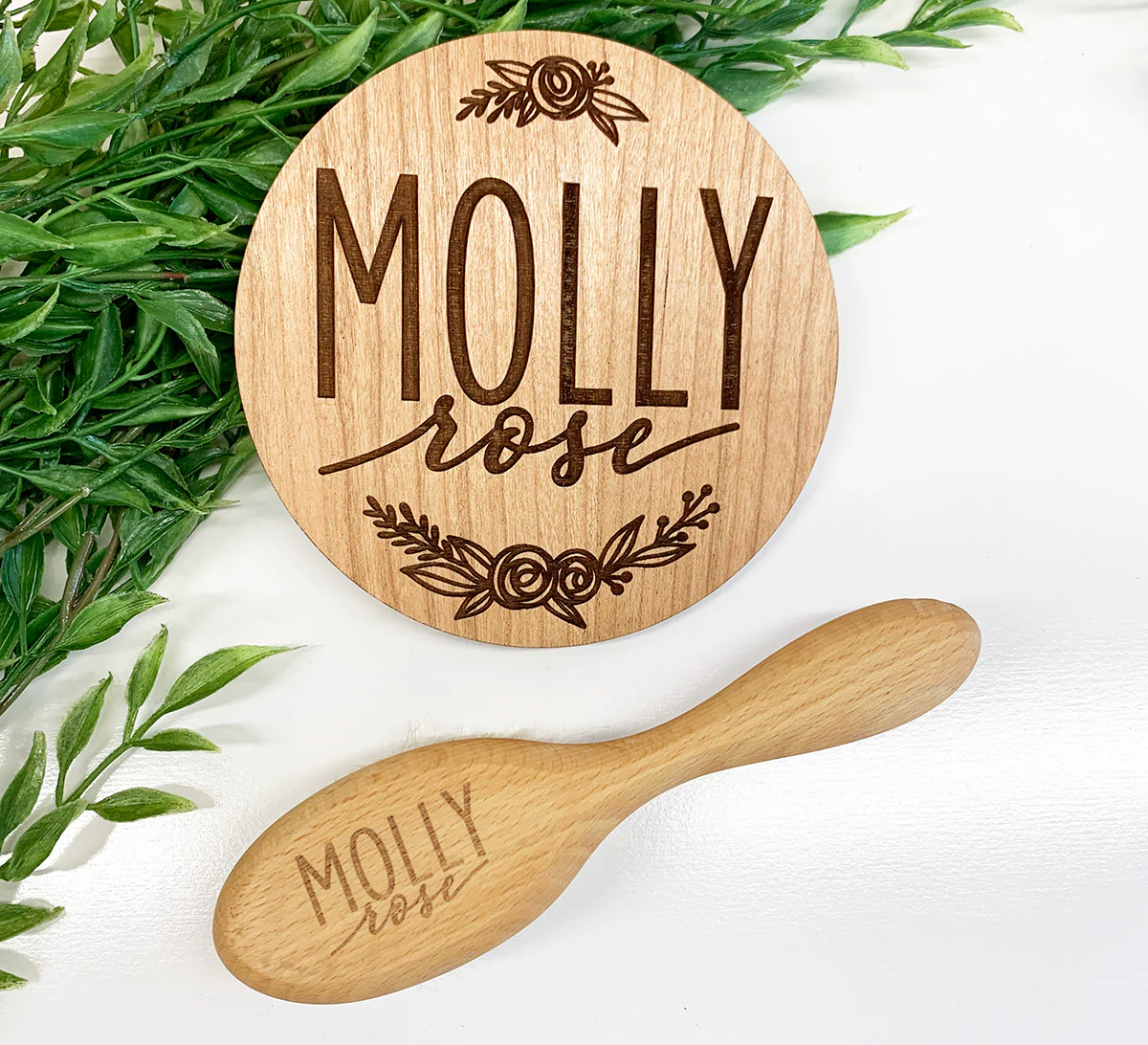 A special gift for the new baby in your life, a 6" engraved name round, perfect for photos, and a personalized wooden hair brush.