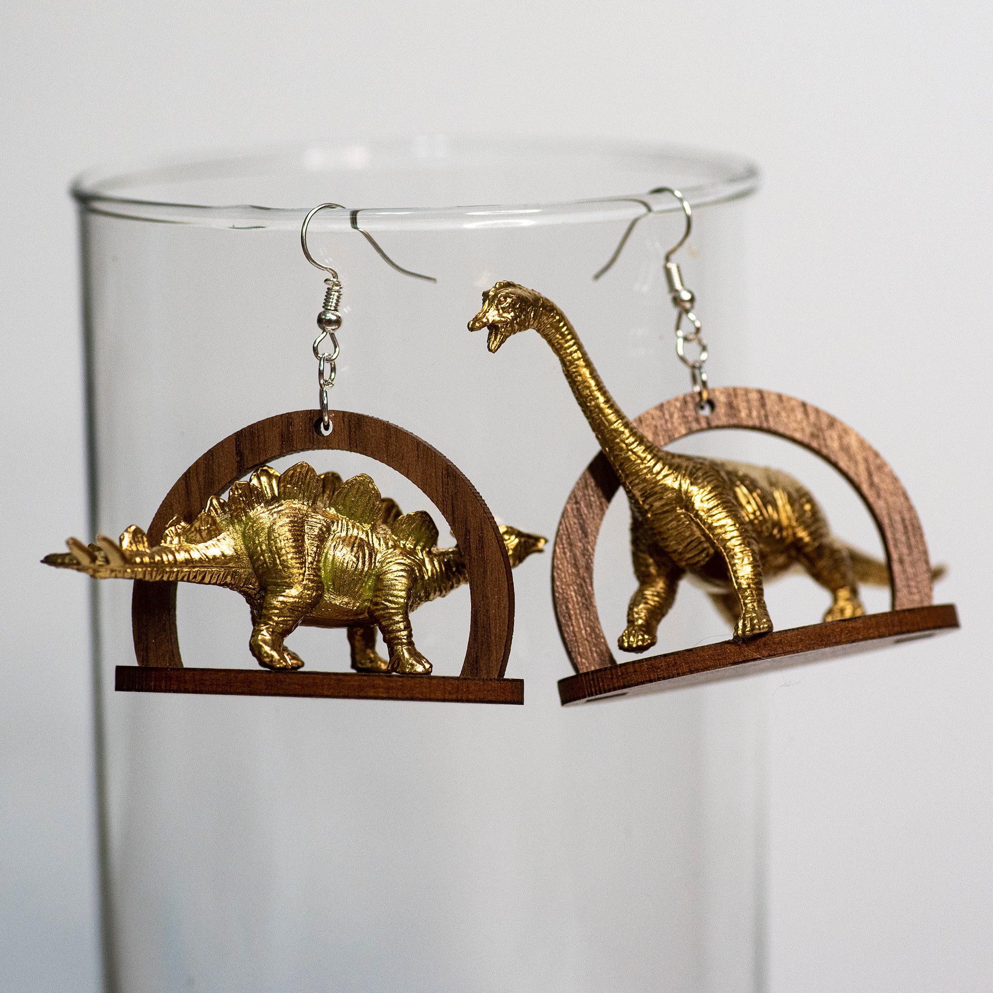 Laser-engraved from high quality walnut plywood, with stainless steel hooks and painted rubber dinosaurs.