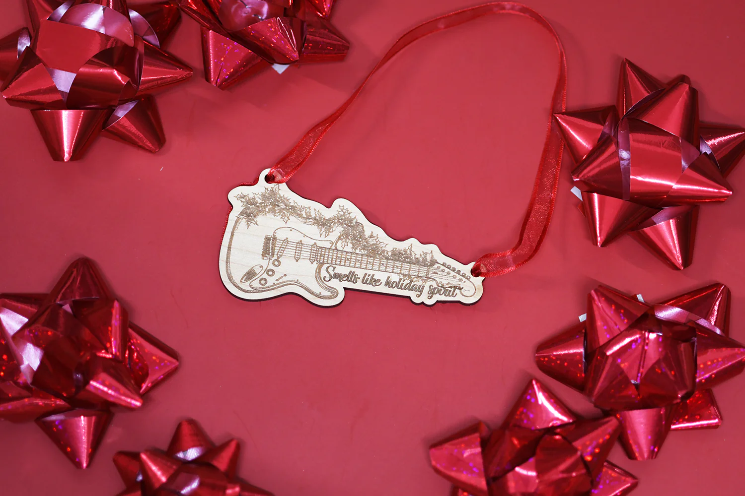This holiday season, let your tree sing with the “Smells Like Holiday Spirit” ornament. Engraved with a classic Stratocaster-inspired electric guitar adorned with a festive garland, this ornament captures the essence of holiday cheer and rock music. The phrase “Smells like holiday spirit” adds a fun and quirky twist, making it a great gift for fans of Nirvana and rock music alike.